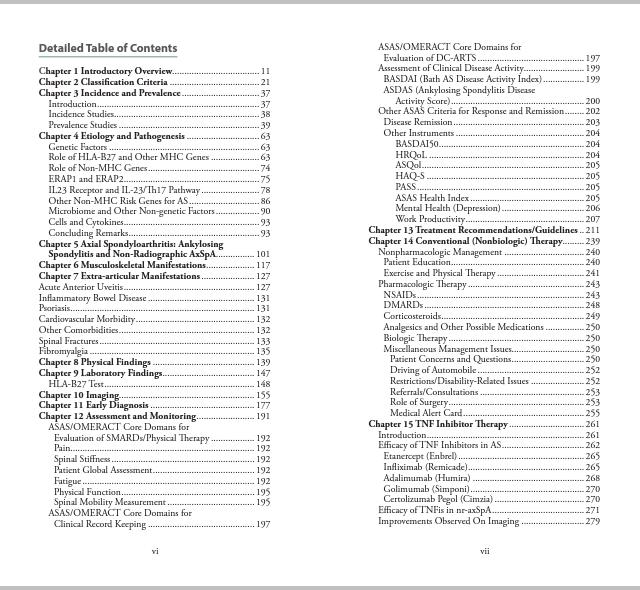 AS and related SpA have a predilection for inflammation at sites where the tendons and ligaments attach to the bones (enthesitis), especially in the sacroiliac joints and the spinal column. The symptoms usually start during late teens or early twenties (rarely after age 45), and is 2 to 3 times more common in males.The presenting clinical manifestations of these diseases can be very wide-ranging, and thus a variety of health care professionals (from primary care physicians, ophthalmologists and dermatologists to rheumatologists and other medical and surgical specialists) see such patients. There is generally good symptomatic relief from back pain with adequate (anti-inflammatory) dose of NSAIDs.The other clinical features of AS and related SpA may include asymmetric arthritis (that more often affects lower extremities) or inflammation of some of the extra-articular structures such as the eye (iritis), the skin (psoriasis) and the gut (Crohn's disease and ulcerative colitis). Unfortunately, most patients with AS are either diagnosed late or are inadequately treated (and some are never diagnosed). The current mean delay in the diagnosis of AS ranges from 5 to 10 years. Earlier diagnosis and treatment can better mitigate the severity of the disease, and make a meaningful difference for patient care and quality of life.With the availability of newer highly effective treatments with TNF-blockers, and better methods of musculoskeletal imaging (such as MRI), there is an urgent need to improve early diagnosis and reduce any inappropriate delay in obtaining effective treatment.